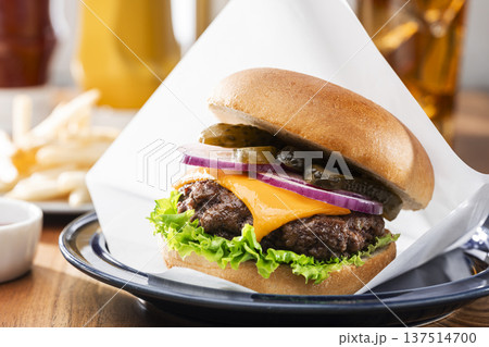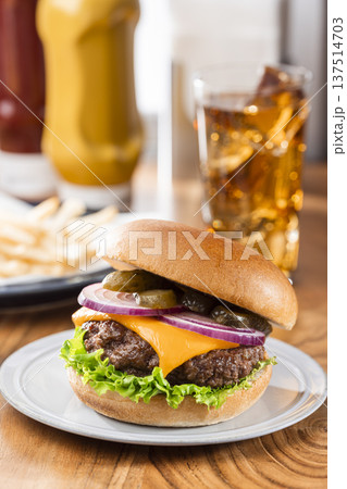 在餐廳內的桌子上享用起司漢堡和薯條午餐
