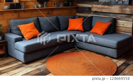 Gray sectional sofa in rustic living room interior