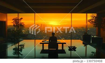 Executive Views City Sunset From Modern Office