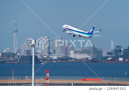 [從羽田機場2號航站樓和東京晴空塔起飛的全日空飛機]