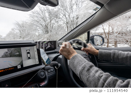 一輛汽車的駕駛座,一名男子在雪道上行駛