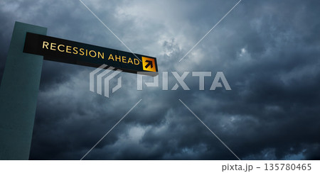 Road sign showing recession ahead against stormy sky. Concept of global recession