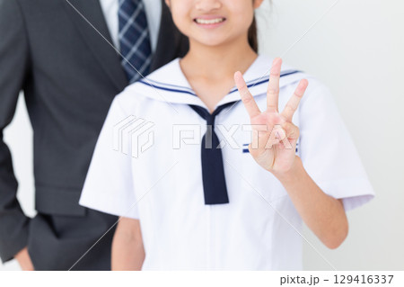 一名身穿夏季校服的中學生和她身穿西裝的父親舉起三根手指