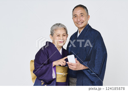 老年夫婦穿著和服一起使用智慧型手機