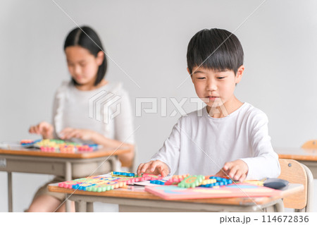 在學校教室裡學習的小學男孩和女孩(女孩,班級,教育)