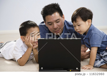Asian father and sons looking at laptop