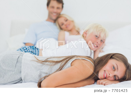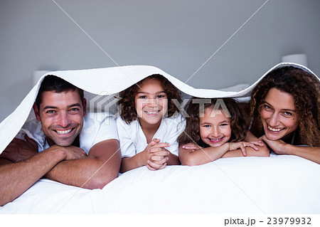 Portrait of happy family lying under a bedsheet