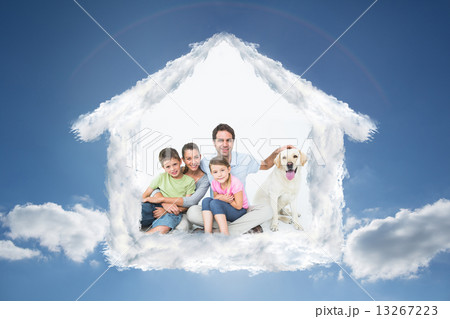 Composite image of cute family with pet labrador posing and smil