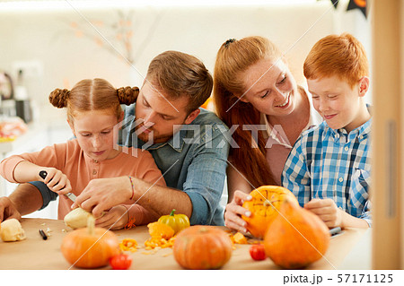 Young family of four enjoying healthy meal in kitchen