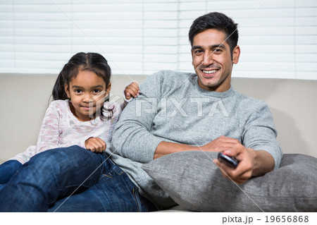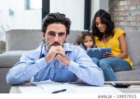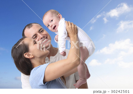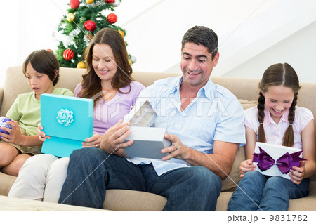 Happy young man with cute little son and his pretty wife sitting in armchair