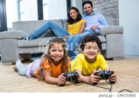 Young beautiful caucasian family, mother and her two cute little kids relaxing on sofa, watching funny videos or cartoons on laptop
