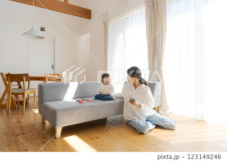 女孩和媽媽在客廳放鬆