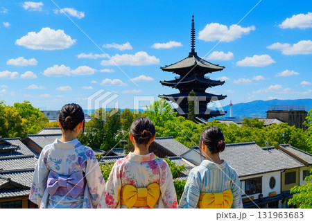 京都:身著和服的日本人以法觀寺為背景拍攝紀念照。