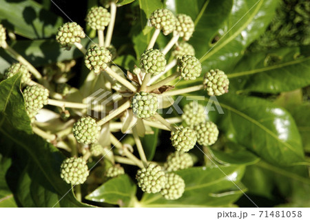 在花朵稀少的時節,八角金盤的花苞卻綻放。