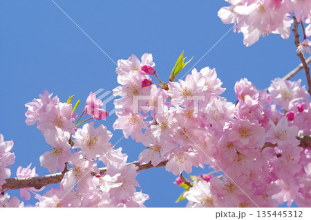 映襯著藍天的粉色櫻花“八重紅西垂”