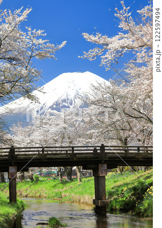 忍野八海路線:新奈莊川沿岸的櫻花盛開,富士山也美不勝收