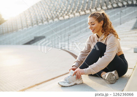 Beautiful woman outdoors and sportswear doing fitness. Concept of sport, recreation.