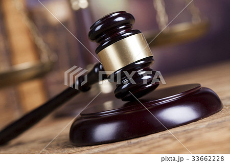 Mallet of the judge, justice scale, wooden