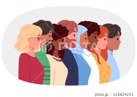 Multinational men and women of different races or religions stand in row, demonstrating unity
