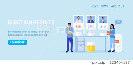 Election results. Two election observers helps counting voting results. Candidates received different numbers of votes. Political competition and democracy. Stacks of ballot papers on table