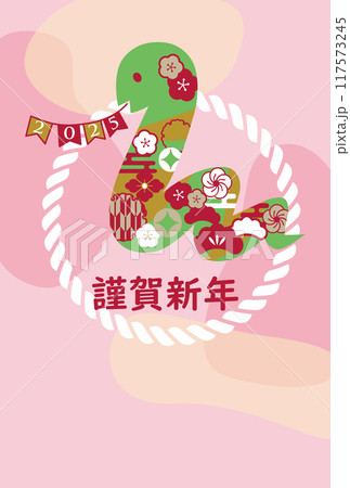 新年賀卡<明信片模板,蛇年,2025,令和7,櫻花,水平位置,垂直文字,新年快樂>