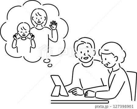 老年夫婦與孫子女進行視訊通話_風景(線條畫)