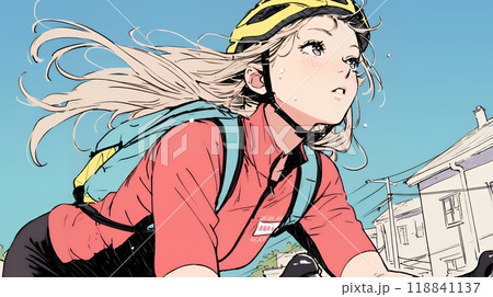 Cyclist riding on open road with mountains in the background wearing helmet and sunglasses bright colors dynamic sky