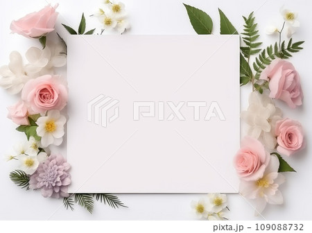 Composition with flowers and blank paper on a beige background. Greetind card mockup. AI Generative.