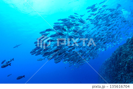 一群美麗的黃鰭鰺(鰺科)正在攻擊一群銀紋圓鯡魚。 Hirizohama Nakagi 南伊豆鎮 伊豆半島 靜岡縣 2024