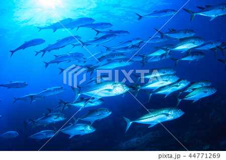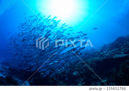 蔚藍的大海和一群大眼鰺。帛琉附近海域的潛水景象。