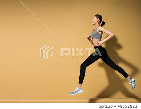 Full length Asian slim Fitness woman exercise warm up stretch spring jumps legs, peri purple