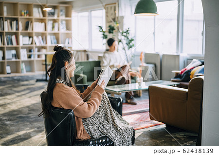The long fabric sofa and round stool tables in a cafe or a lounge with green painted and brick wall.