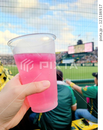 在甲子園球場的觀眾席上邊吃邊看棒球