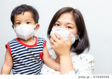 Caucasian family in protective masks and gloves isolated at home with coronavirus symptoms, treatment