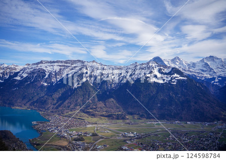 瑞士阿爾卑斯山的雪山和山腳下的城鎮景觀