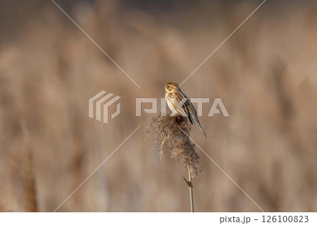 一隻蘆鹀在冬日蘆葦叢中悠閒地休息