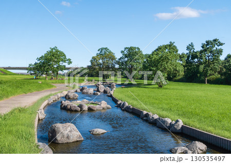 宮崎市大淀川市民綠地的濱水公園,潺潺水流與蔚藍天空的景色