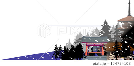 雪景日本寺廟和五層寶塔冬季景色插圖背景素材