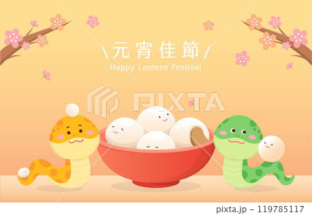 中國元宵節或冬至或新年的海報,蛇與湯圓,亞洲的糯米傳統食物
