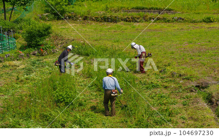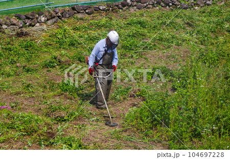 在休耕地的岸邊用自行式割草機除草