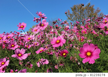 秋天景色:長岡京市休耕地上盛開的波斯菊