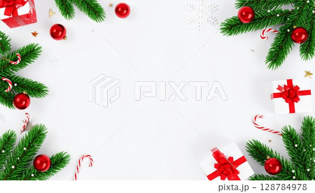 Christmas holiday frame with fir tree branches, festive decorations, and balls on a winter background for greeting card design