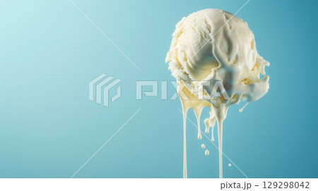 Melting scoop of vanilla ice cream with plain background.