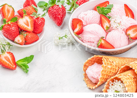 Strawberry ice cream scoop with fresh strawberries and icecream cones on a light background, top view. copy space