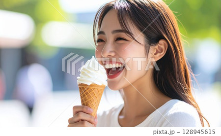 一位年輕女子在夏日的天空下吃軟冰淇淋(蛋筒冰淇淋)(簡單的顏色)