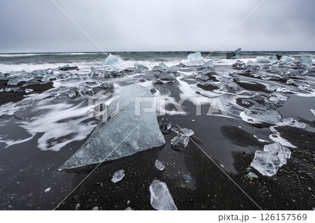 View of the melting glacier on the diamond beach on Jokulsarlon, Iceland. Nature, travel, climate change, global warming, winter background, or wallpaper
