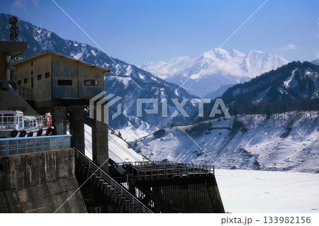 Snow covered Tateyama Kurobe Dam with beautiful Japan Alps, Toyama