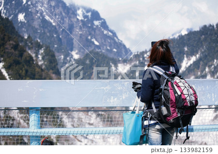 Tourist woman photo Tateyama Kurobe Dam covered by snow, Toyama