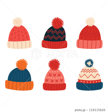 Cartoon Winter Hats. Headwear with Buboes, Warm Clothes, Hats with Different Textures. Simple Flat Vector Illustrations in Cartoon Style on White Background. Cozy Winter Accessories
