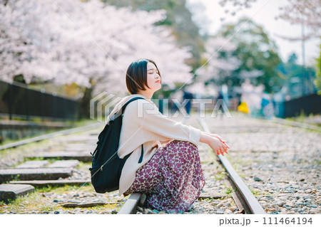 一個年輕的女人,看著櫻花坐在京都市京都市東山區踢線的軌道上